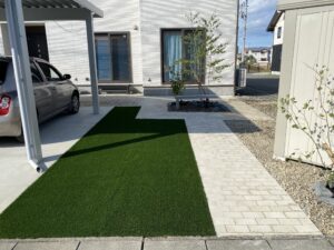 ご新築時にカーポートや駐車場土間などは整えてはいたものの、お庭スペースは手つかずのまま雑草対策に悩まされていたお客様。ご近所に当社の施工されたお宅があり、お声掛けいただきました。収納力のある大きさの物置とお子様も遊べてオ […]