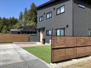 とても広い敷地に4台分の駐車スペース、人工芝とアプローチ、そして隣地境界には高さ1.6mの木調フェンスを設置しました。ブラック系の外壁・木目のドアと調和しています。お客様のご希望でアプローチは明るい印象に。4色の石材調イ […]