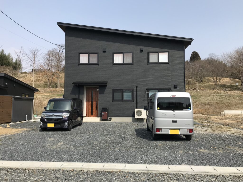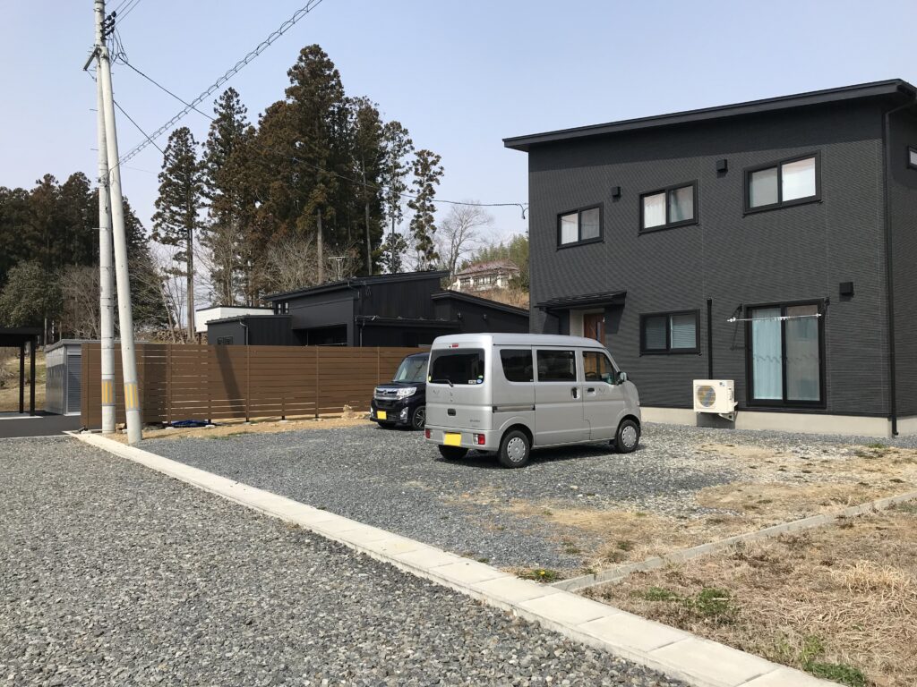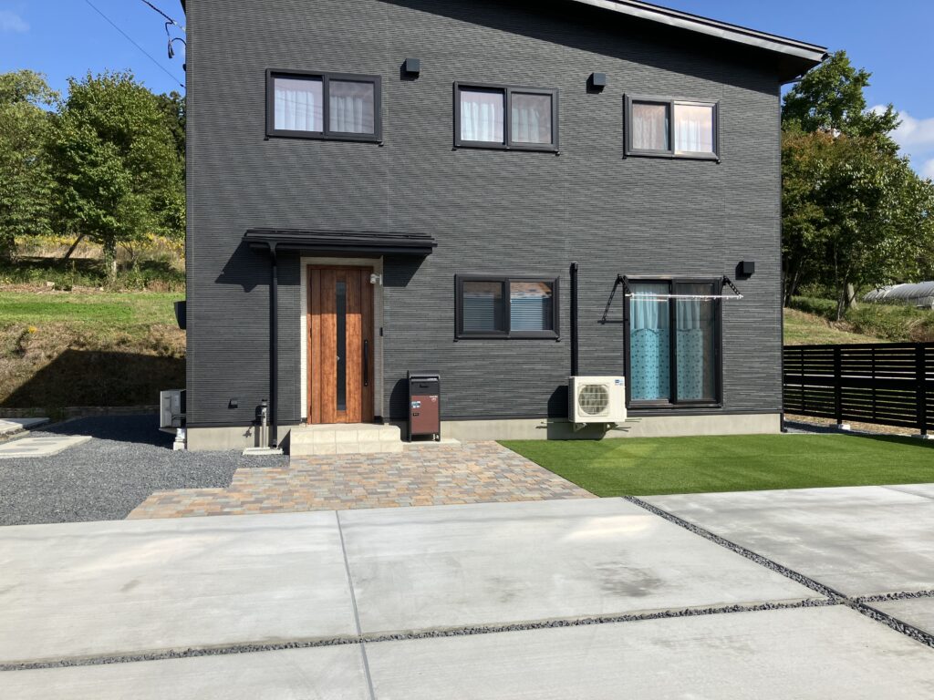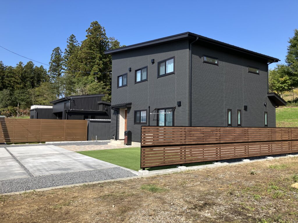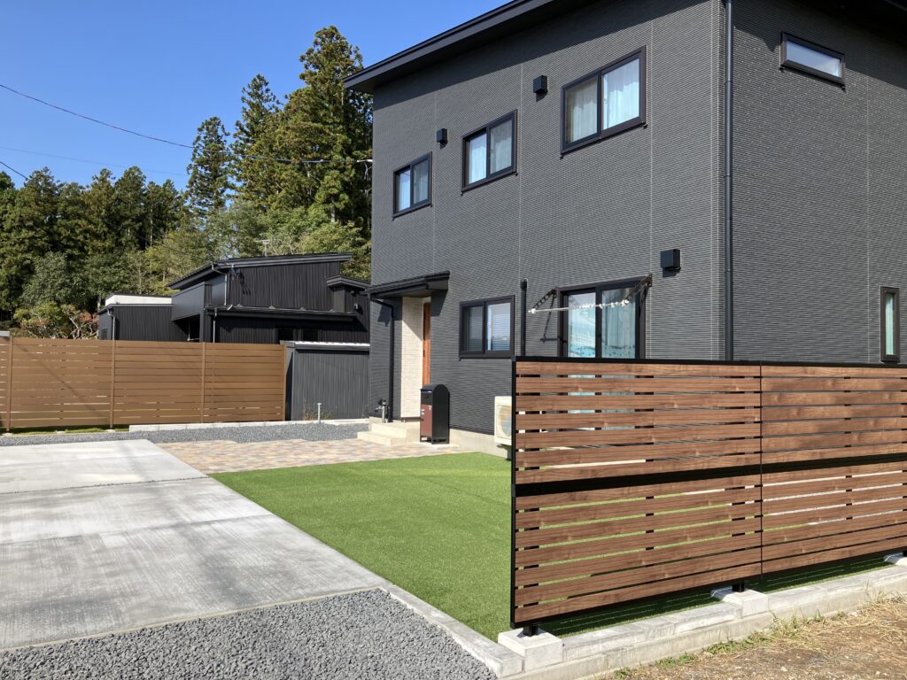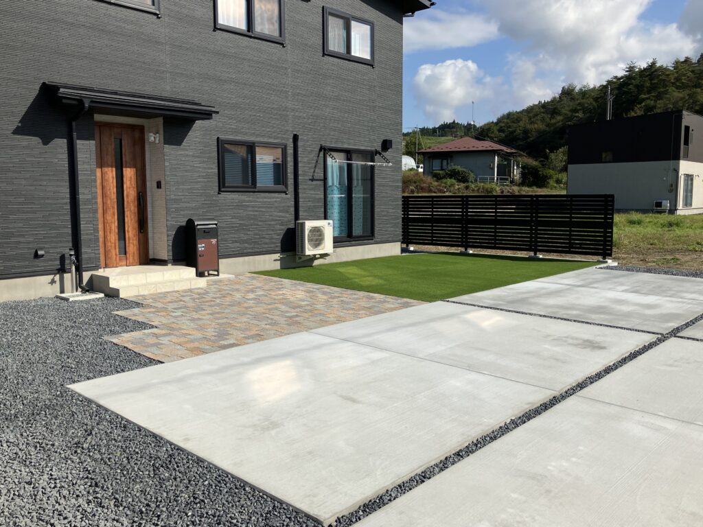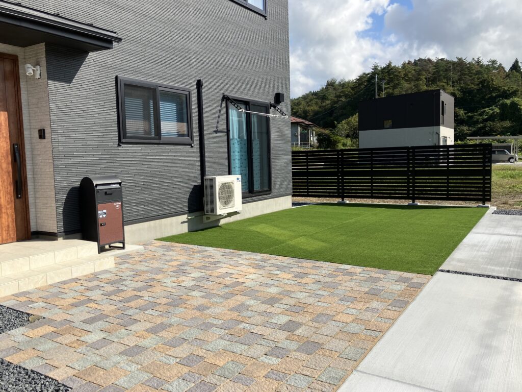 とても広い敷地に4台分の駐車スペース、人工芝とアプローチ、そして隣地境界には高さ1.6mの木調フェンスを設置しました。ブラック系の外壁・木目のドアと調和しています。お客様のご希望でアプローチは明るい印象に。4色の石材調インターロッキングを使用しています。