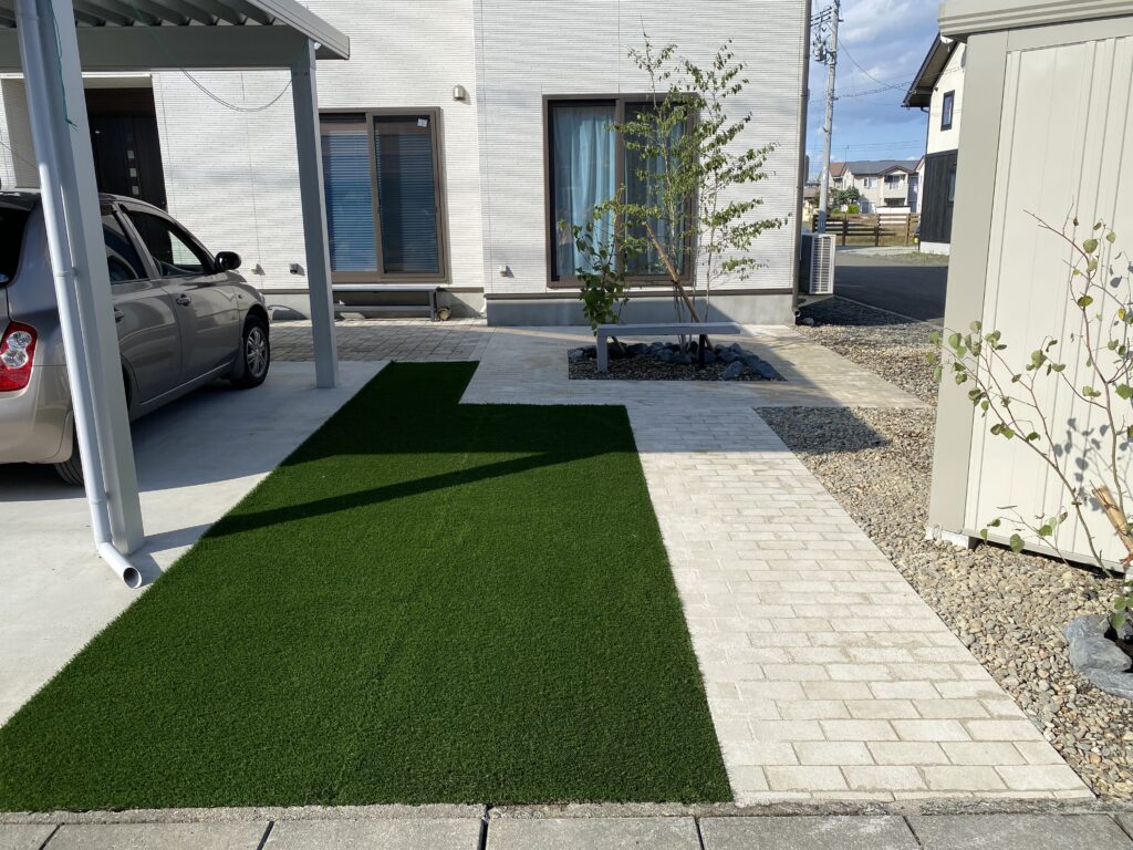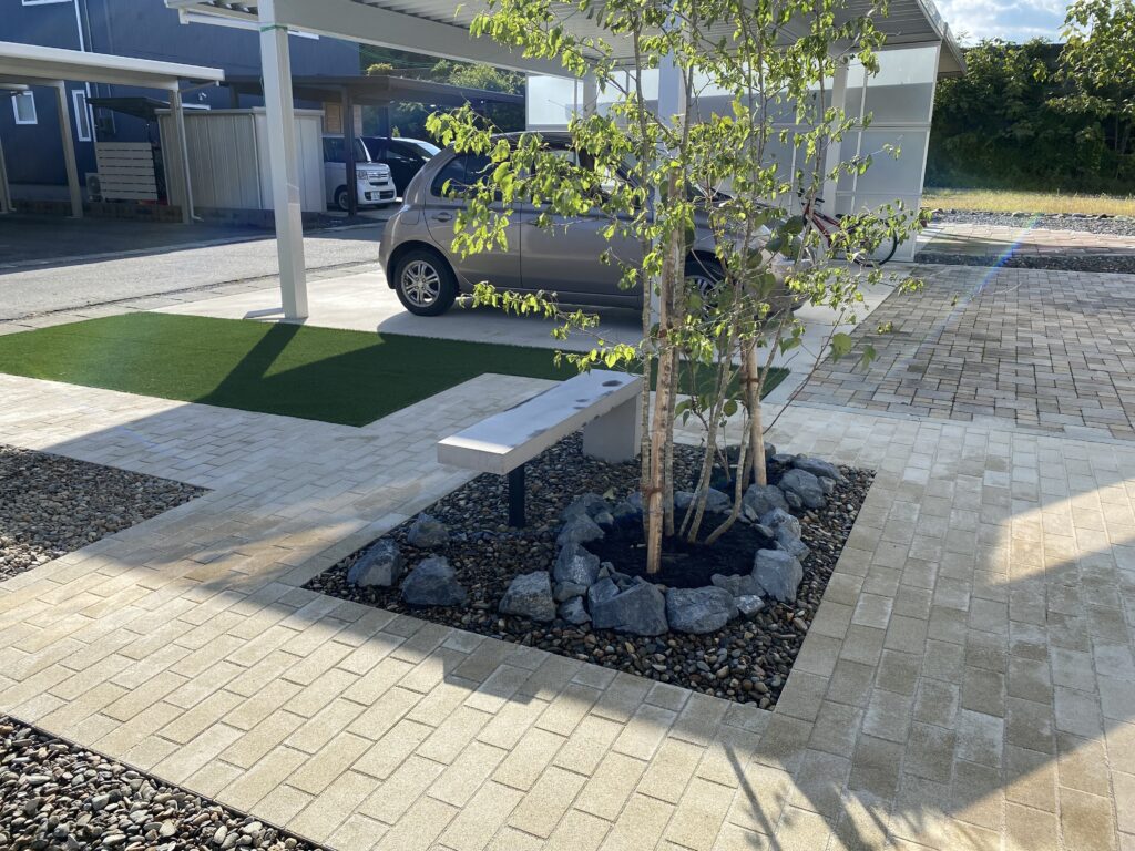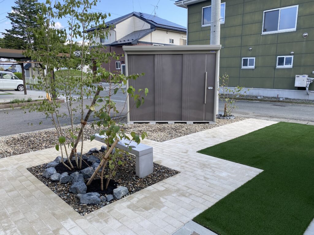 ご新築時にカーポートや駐車場土間などは整えてはいたものの、お庭スペースは手つかずのまま雑草対策に悩まされていたお客様。ご近所に当社の施工されたお宅があり、お声掛けいただきました。収納力のある大きさの物置とお子様も遊べてオシャレなお庭が欲しいとのご要望に応え、シンボルツリーとベンチをフォーカルポイントにして、シンプルで建物に映えるお庭が完成しました。
